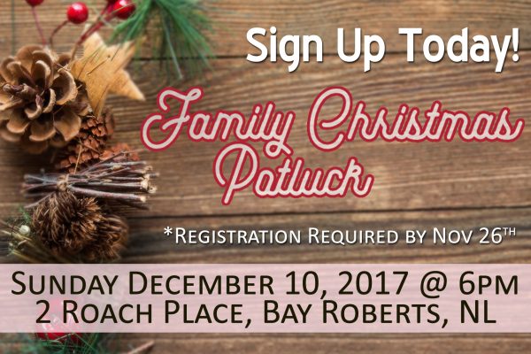 Register 2017-12-10 18:00 2017-12-10 20:30 America/St_Johns Family Christmas Potluck 2017 2 Roach Place, Bay Roberts, NL A0A 1G0, Canada info@bethelbr.com